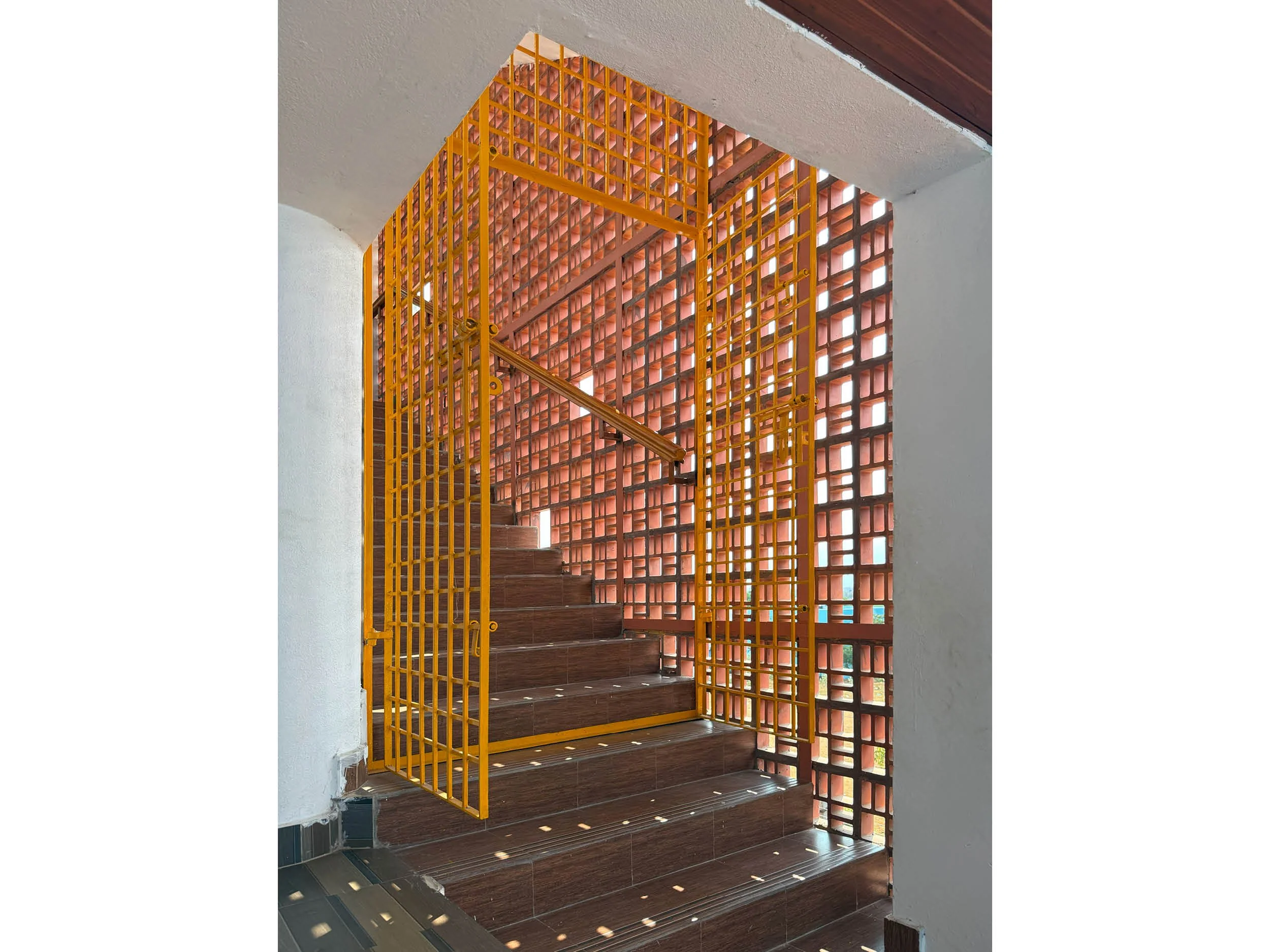 Across the exposed west side of the building —which receives significant solar gain in the hot afternoons — a large, contemporary jali made of terracotta (less carbon intensive than concrete) permits natural cross-ventilation while shading the stairways and open-air corridors. At the roof level, large photovoltaic canopies act like parasols, shading the building while harvesting solar energy.