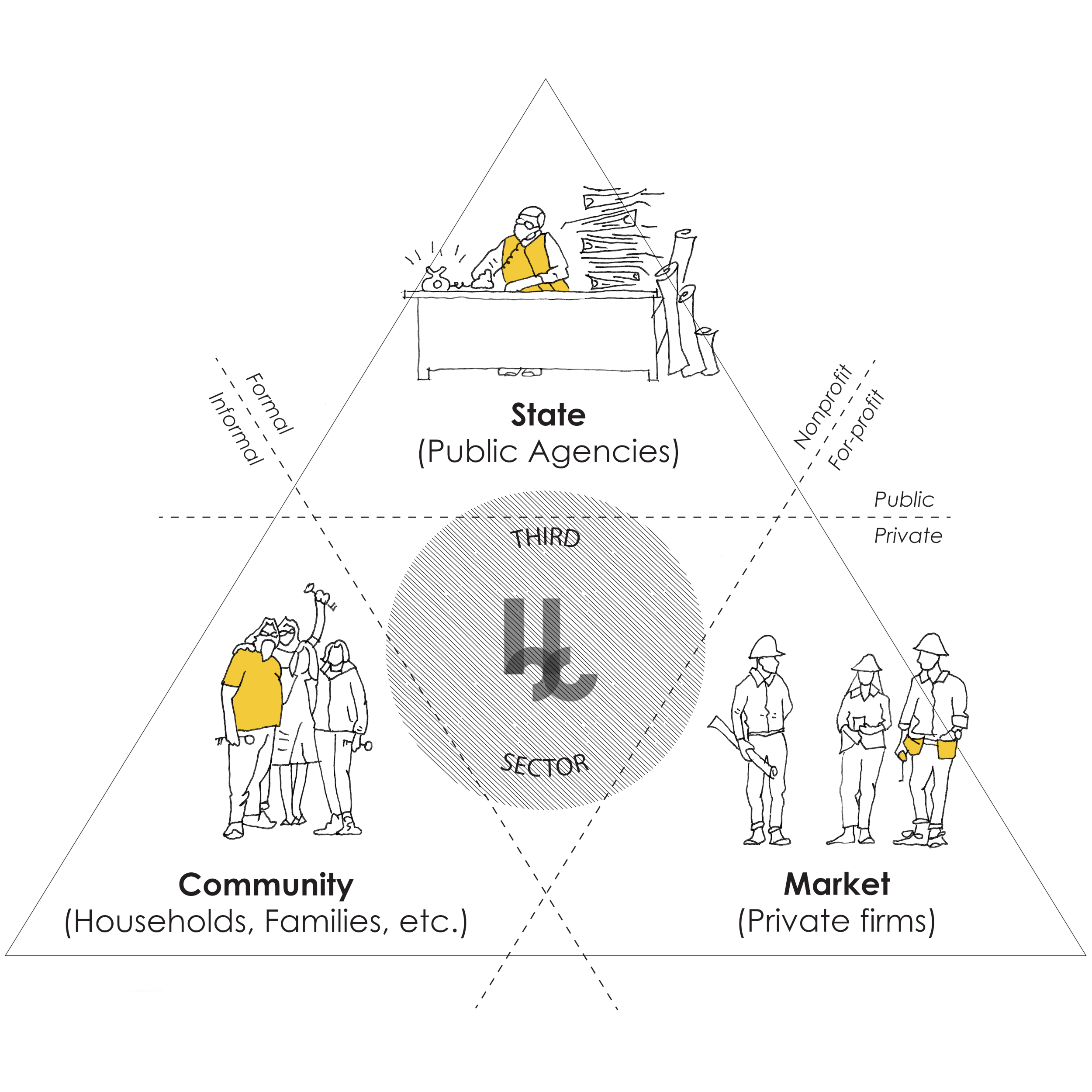 Figure | Our rendition of Victor Pestoff’s “Welfare Triangle” showing the “Third Sector” at the nexus of public and private, formal and informal, and for-profit and nonprofit entities.